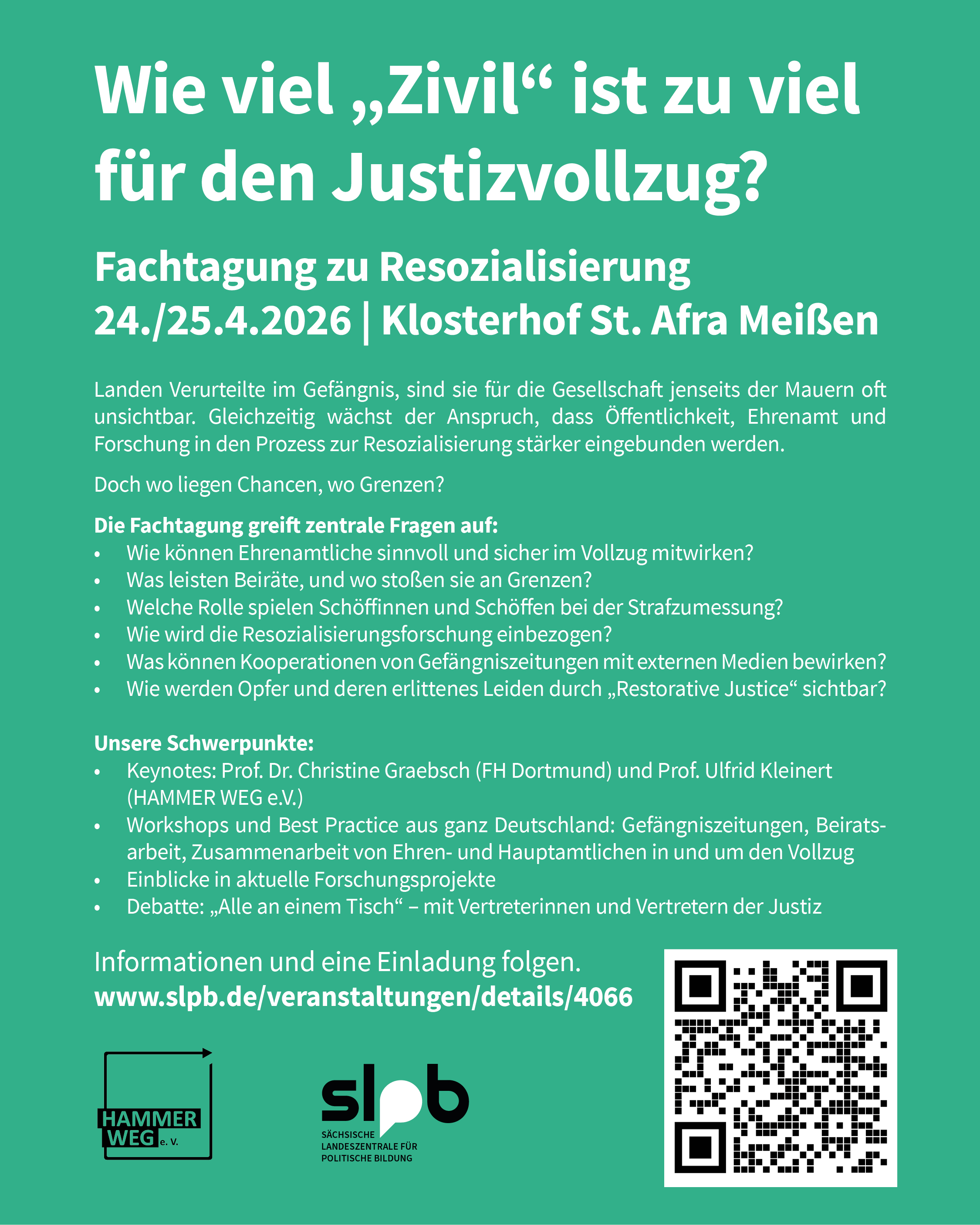 | 2023 | „Alles wieder gut?“: Gemeinsame Tagung von SLpB und HAMMER WEG e.V. zu Restorative Justice, Täter-Opfer-Ausgleich und Wiedergutmachung in Sachsens Justiz |